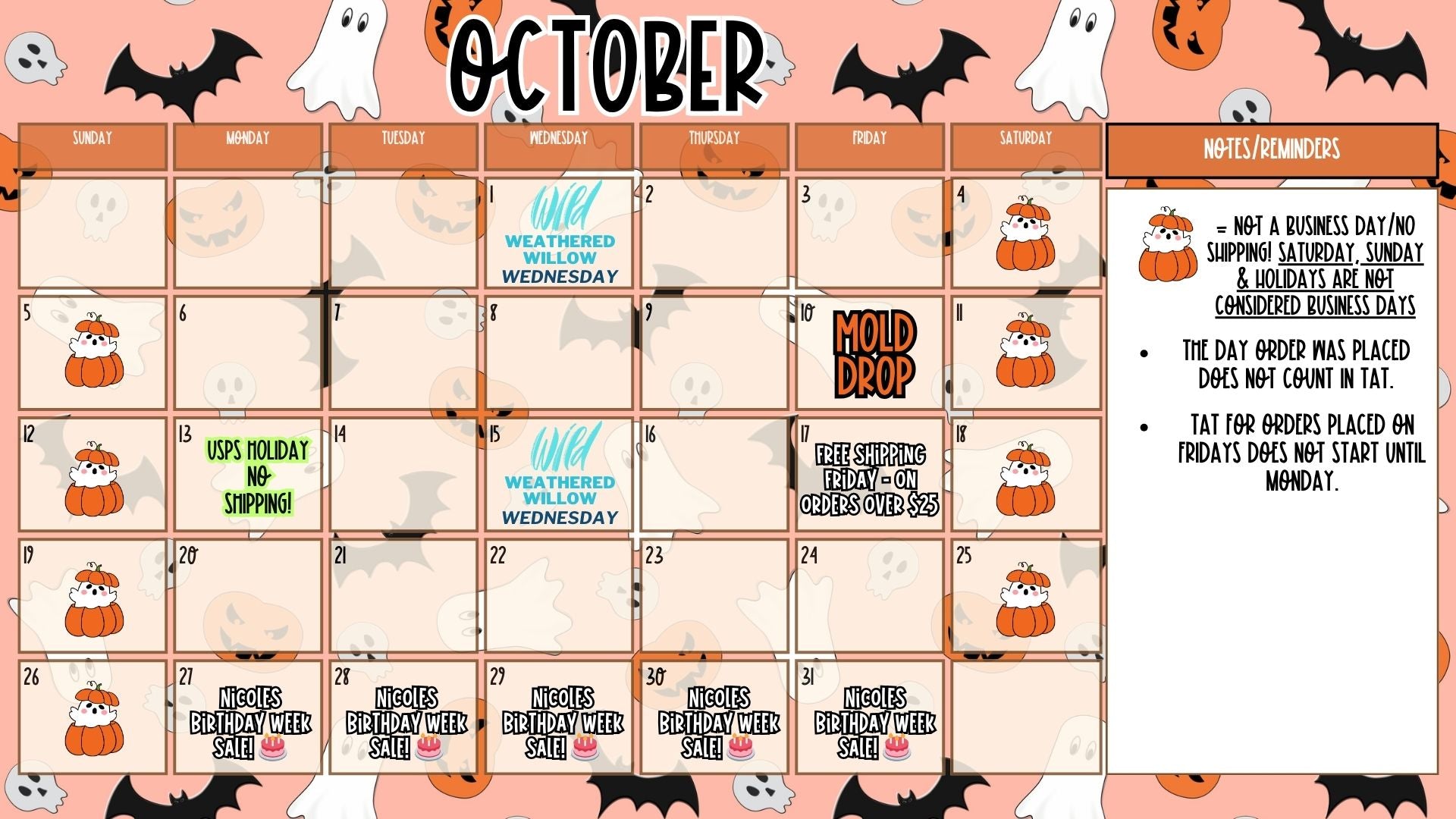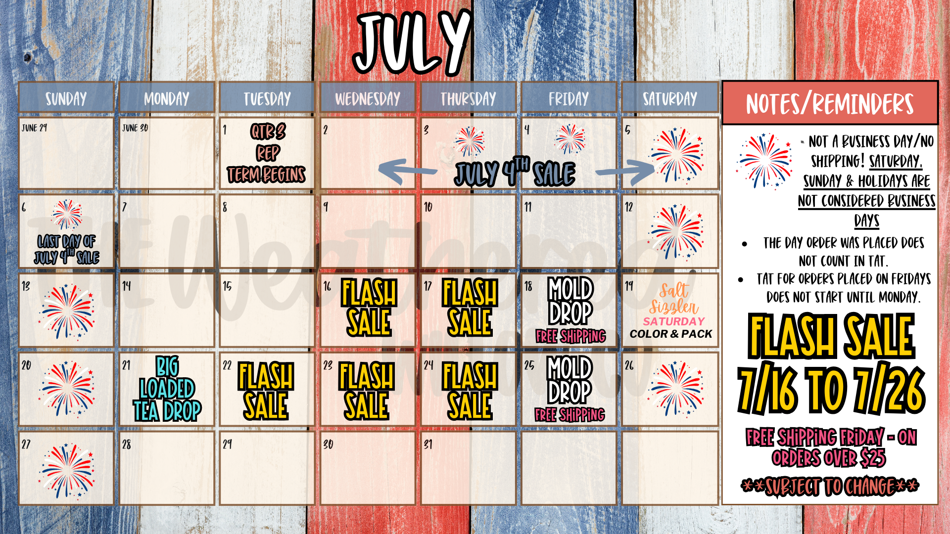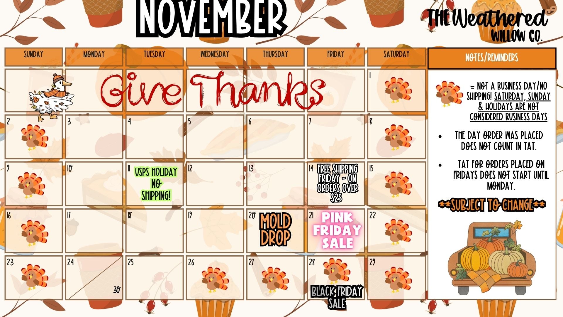 Our monthly calendars will include any important information for the current month! Including but not limited to: TAT information, mold drops, new item drops, scheduled sales, etc! Please see current month below. For the most up to date information, please be sure to join our Facebook group!